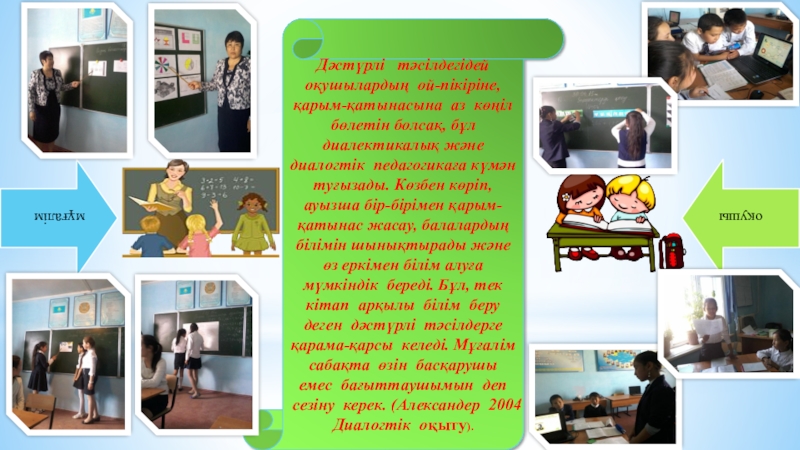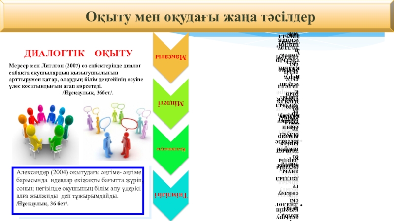 Александер (2004) оқытудағы әңгіме- әңгіме барысында идеялар екіжақты бағытта жүріп,соның негізінде оқушының білім алу үдерісі алға жылжиды деп тұжырымдайды.