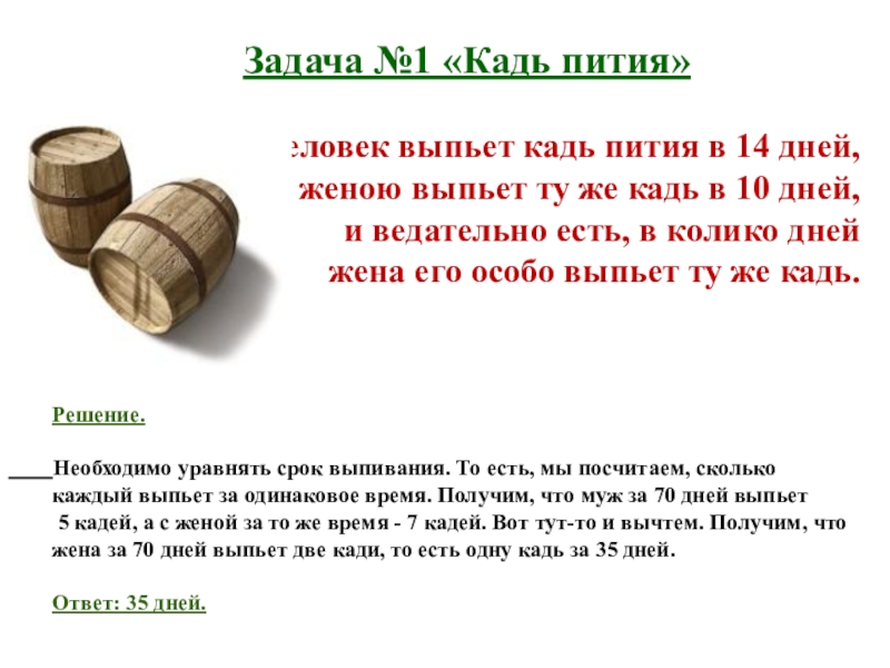 каждый выпьет за одинаковое время. Получим, что муж за 70 дней выпьет