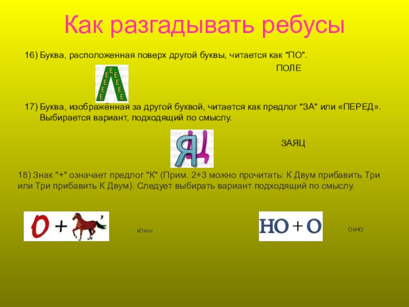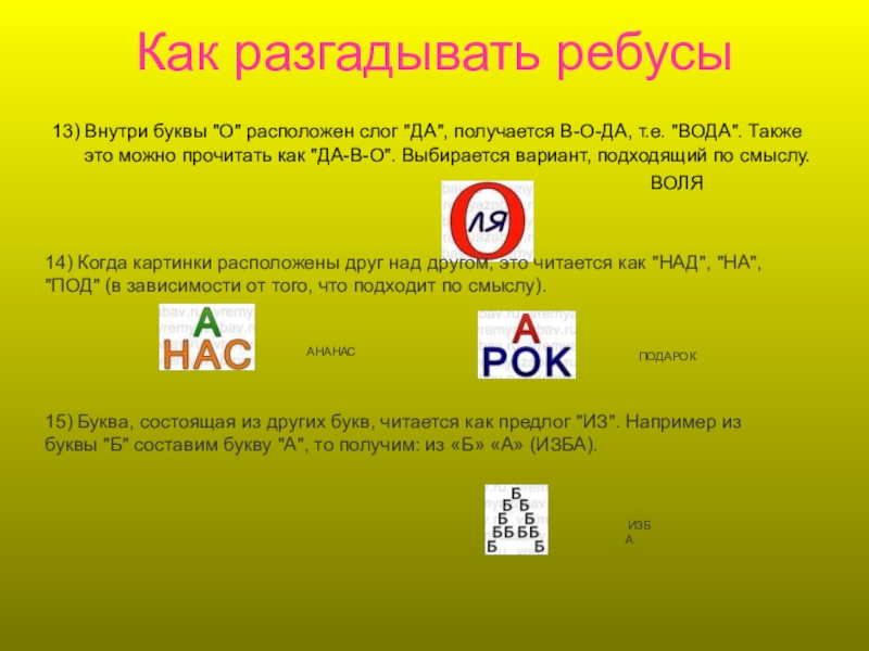 15) Буква, состоящая из других букв, читается как предлог "ИЗ". Например из буквы "Б" составим букву "А", то получим: из «Б» «А» (ИЗБА).