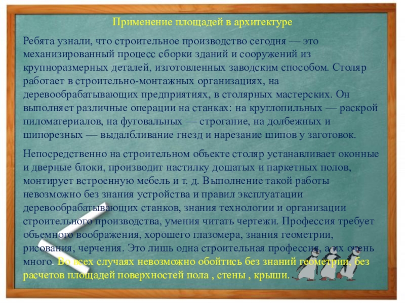 Непосредственно на строительном объекте столяр устанавливает оконные и дверные блоки, производит настилку дощатых и паркетных полов, монтирует встроенную мебель и т. д. Выполнение такой работы невозможно без знания устройства и правил эксплуатации деревообрабатывающих станков, знания технологии и организации строительного производства, умения читать чертежи. Профессия требует объемного воображения, хорошего глазомера, знания геометрии, рисования, черчения. Это лишь одна строительная профессия, а их очень много. Во всех случаях невозможно обойтись без знаний геометрии, без расчетов площадей поверхностей пола , стены , крыши.