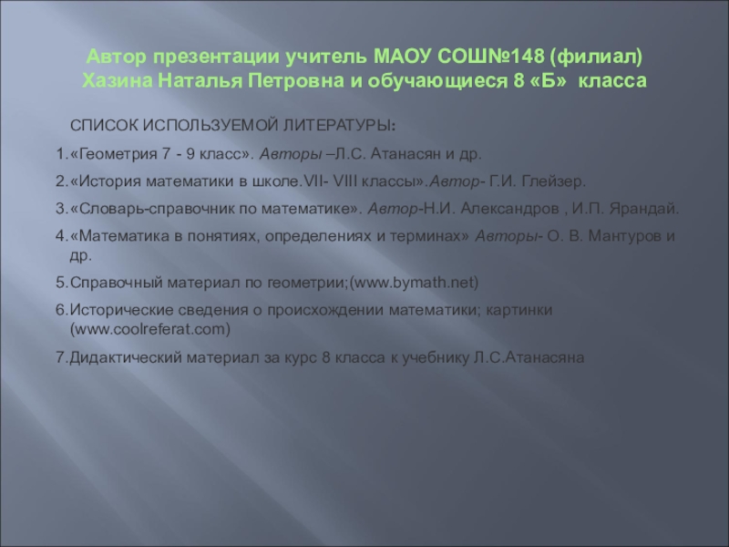 «Геометрия 7 - 9 класс». Авторы –Л.С. Атанасян и др.