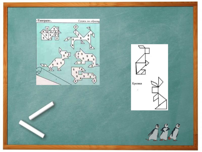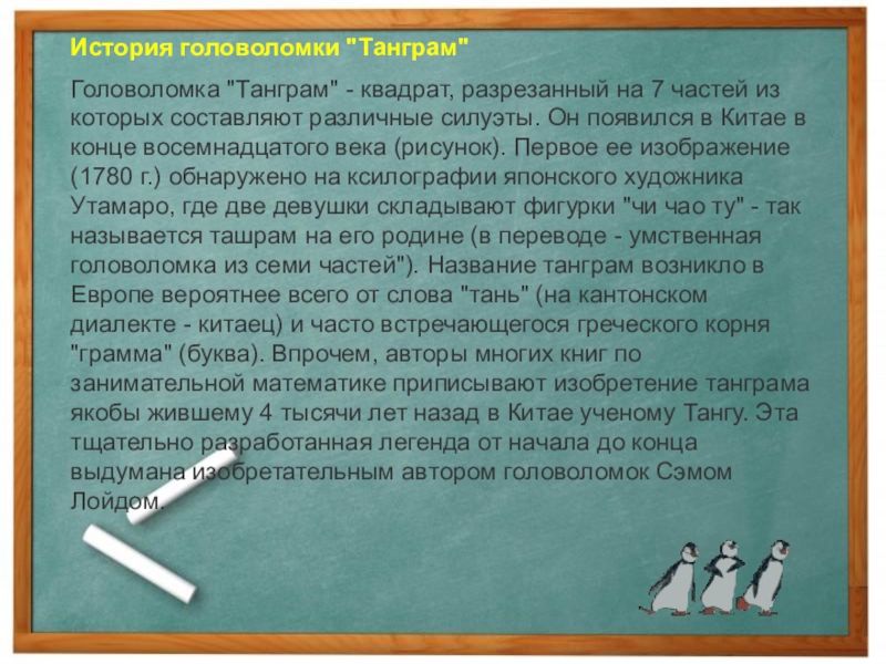 которых составляют различные силуэты. Он появился в Китае в конце восемнадцатого века (рисунок). Первое ее изображение (1780 г.) обнаружено на ксилографии японского художника Утамаро, где две девушки складывают фигурки "чи чао ту" - так называется ташрам на его родине (в переводе - умственная головоломка из семи частей"). Название танграм возникло в Европе вероятнее всего от слова "тань" (на кантонском диалекте - китаец) и часто встречающегося греческого корня "грамма" (буква). Впрочем, авторы многих книг по занимательной математике приписывают изобретение танграма якобы жившему 4 тысячи лет назад в Китае ученому Тангу. Эта тщательно разработанная легенда от начала до конца выдумана изобретательным автором головоломок Сэмом Лойдом.