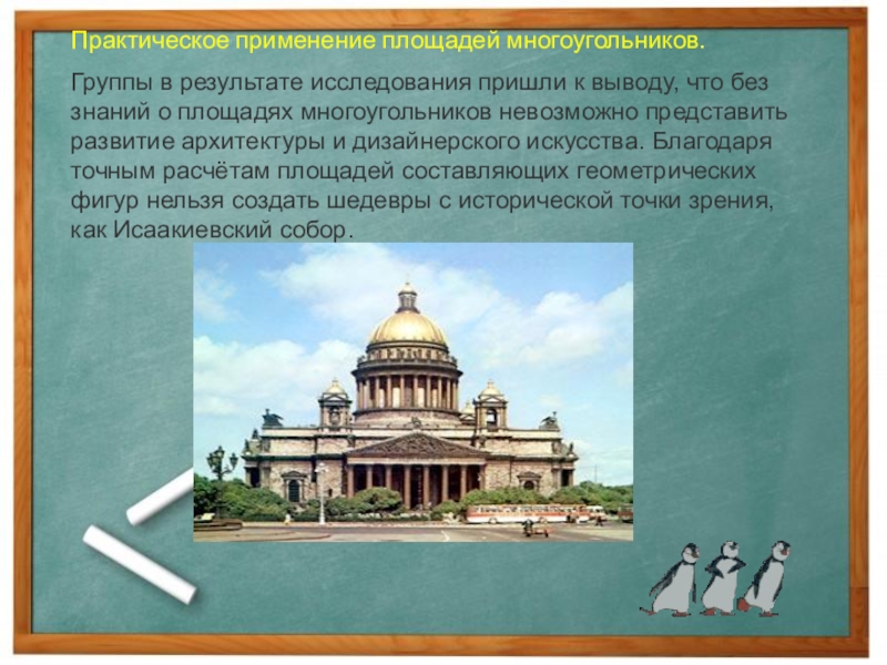 без знаний о площадях многоугольников невозможно представить развитие архитектуры и дизайнерского искусства. Благодаря точным расчётам площадей составляющих геометрических фигур нельзя создать шедевры с исторической точки зрения, как Исаакиевский собор.