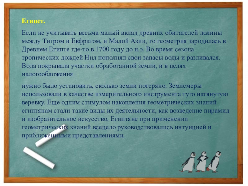 нужно было установить, сколько земли потеряно. Землемеры использовали в качестве измерительного инструмента туго натянутую веревку. Еще одним стимулом накопления геометрических знаний египтянам стали такие виды их деятельности, как возведение пирамид и изобразительное искусство. Египтяне при применении геометрических знаний всецело руководствовались интуицией и приближенными представлениями.