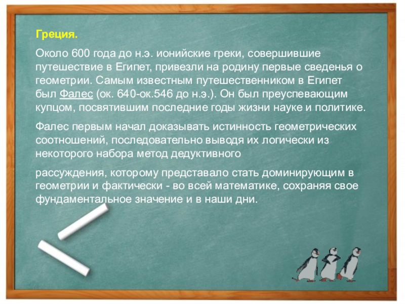 привезли на родину первые сведенья о геометрии. Самым известным путешественником в Египет был Фалес (ок. 640-ок.546 до н.э.). Он был преуспевающим купцом, посвятившим последние годы жизни науке и политике.