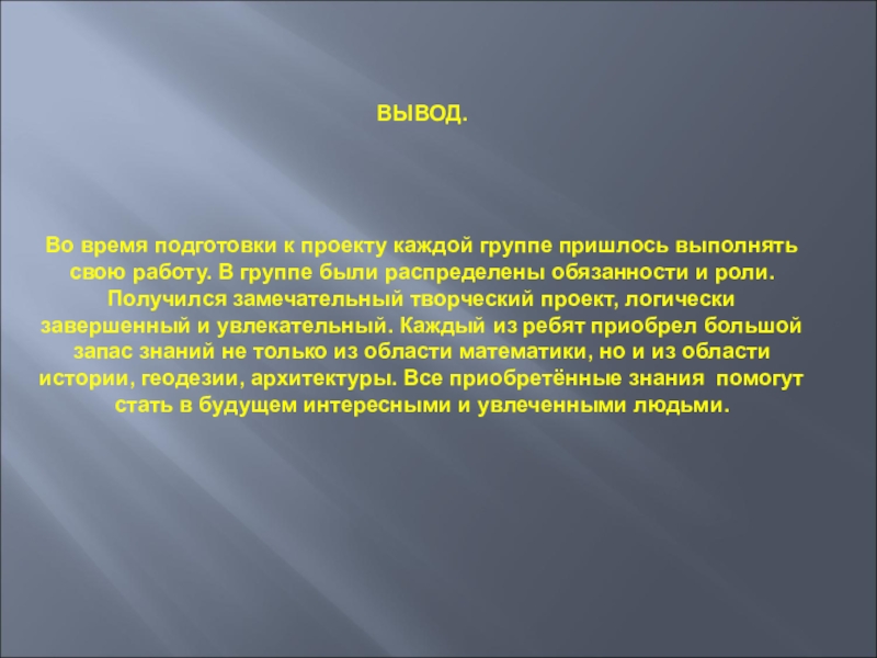В группе были распределены обязанности и роли. Получился замечательный творческий проект, логически завершенный и увлекательный. Каждый из ребят приобрел большой запас знаний не только из области математики, но и из области истории, геодезии, архитектуры. Все приобретённые знания помогут стать в будущем интересными и увлеченными людьми.
