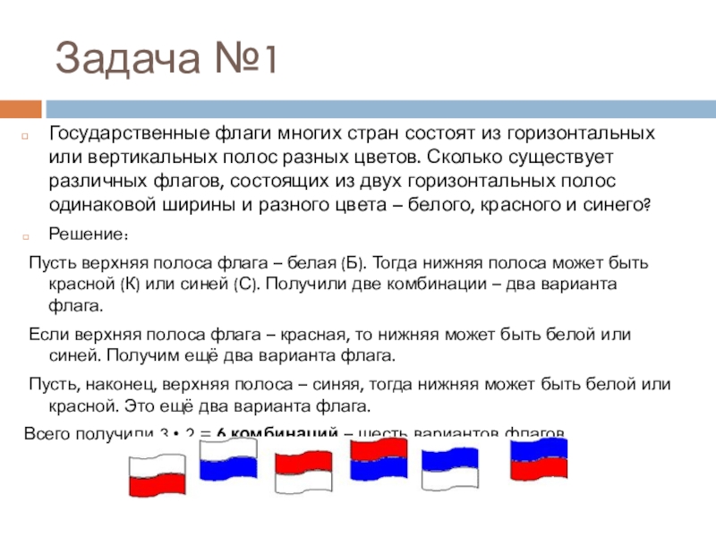 Пусть верхняя полоса флага – белая (Б). Тогда нижняя полоса может быть красной (К) или синей (С). Получили две комбинации – два варианта флага.