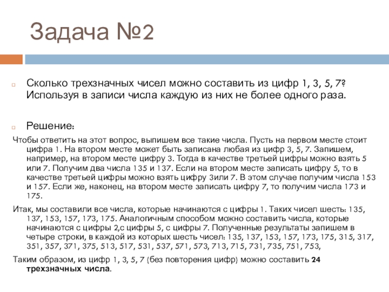 Итак, мы составили все числа, которые начинаются с цифры 1. Таких чисел шесть: 135, 137, 153, 157, 173, 175. Аналогичным способом можно составить числа, которые начинаются с цифры 2,с цифры 5, с цифры 7. Полученные результаты запишем в четыре строки, в каждой из которых шесть чисел: 135, 137, 153, 157, 173, 175, 315, 317, 351, 357, 371, 375, 513, 517, 531, 537, 571, 573, 713, 715, 731, 735, 751, 753,