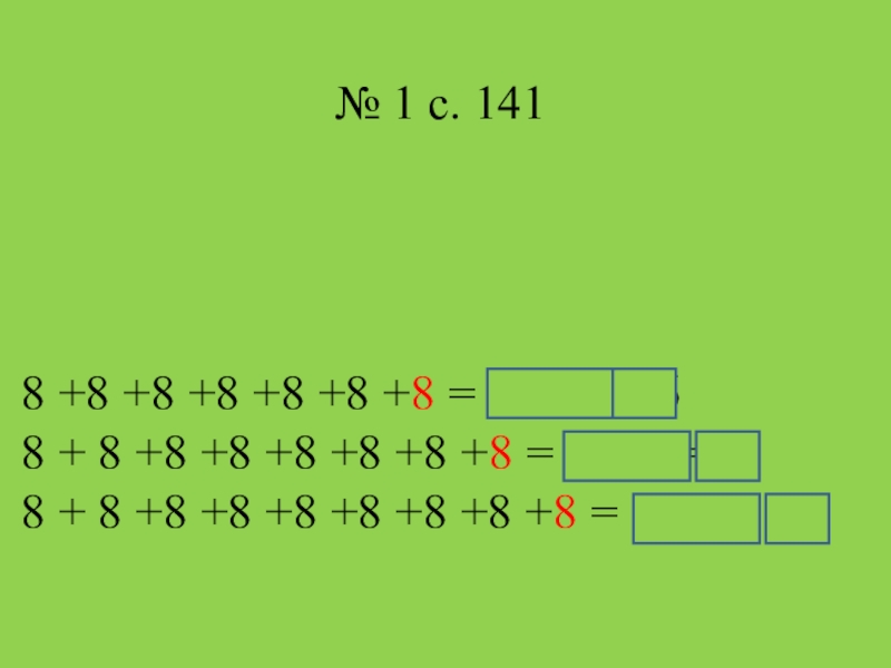 № 1 с. 141 8 +8 +8 +8 +8 +8 +8 = 8 · 7 = 56 8 + 8 +8 +8 +8 +8 +8 +8 = 8 · 8 = 64 8 + 8 +8 +8 +8 +8 +8 +8 +8 = 8 · 9 = 72