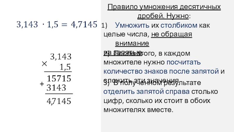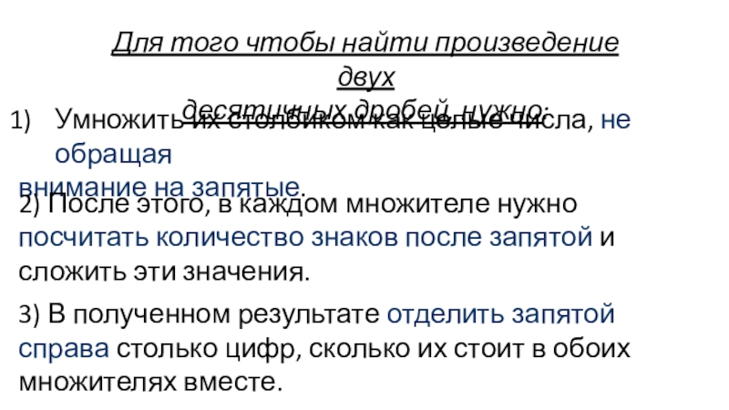3) В полученном результате отделить запятой справа столько цифр, сколько их стоит в обоих множителях вместе.