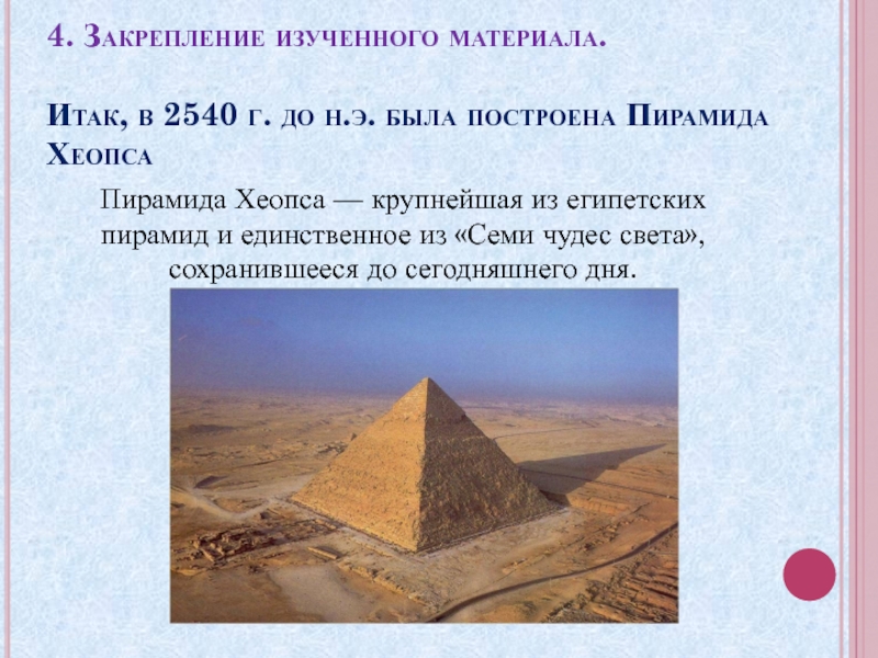 Пирамида Хеопса — крупнейшая из египетских пирамид и единственное из «Семи чудес света», сохранившееся до сегодняшнего дня.