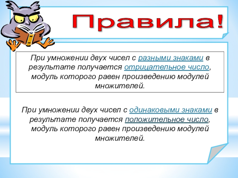 При умножении двух чисел с одинаковыми знаками в результате получается положительное число, модуль которого равен произведению модулей множителей.