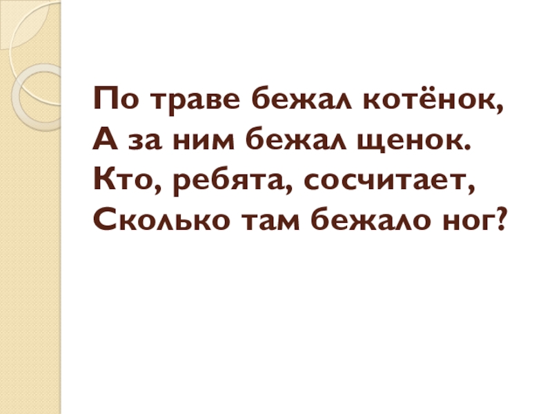 По траве бежал котёнок, А за ним бежал щенок. Кто, ребята, сосчитает, Сколько там бежало ног?