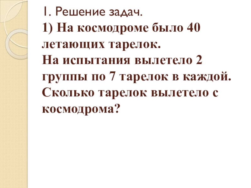 1. Решение задач. 1) На космодроме было 40 летающих тарелок. На испытания вылетело 2 группы по 7