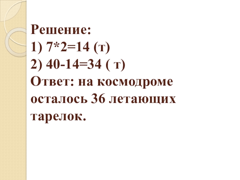 Слайд 10Решение: 1) 7*2=14 (т) 2) 40-14=34 ( т) Ответ: на космодроме осталось 36 летающих