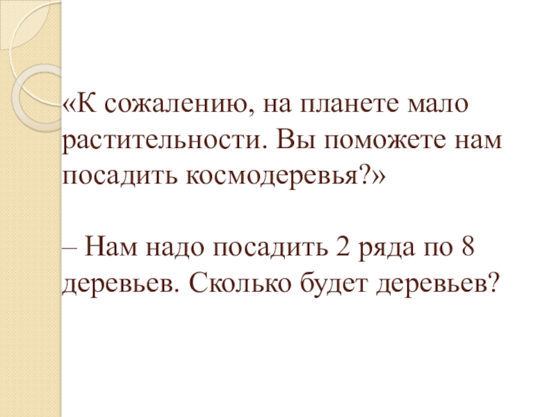 Слайд 14«К сожалению, на планете мало растительности. Вы поможете нам посадить космодеревья?» –