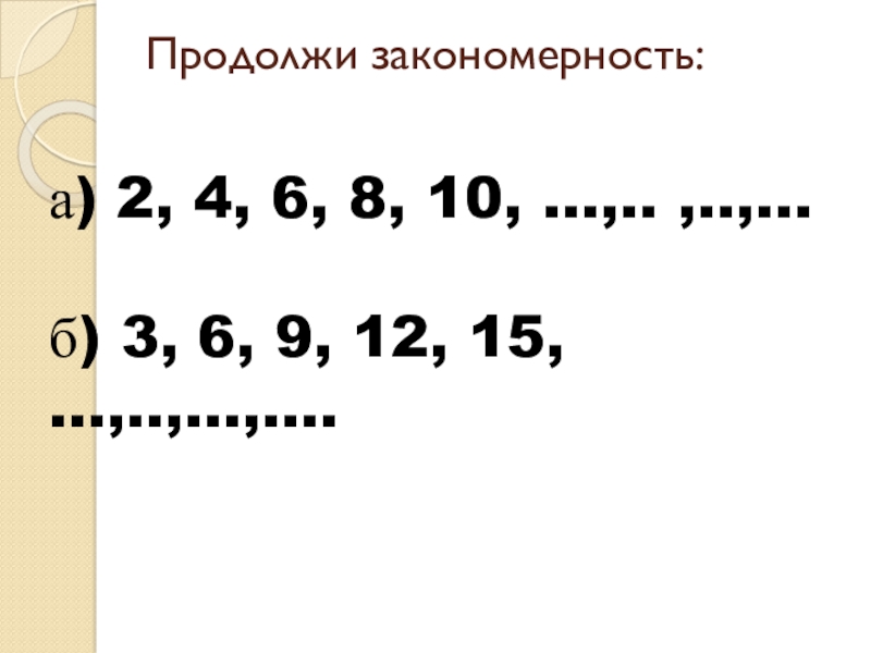 Продолжи закономерность:  а) 2, 4, 6, 8, 10, …,.. ,..,… б) 3, 6, 9, 12, 15,…,..,…,….