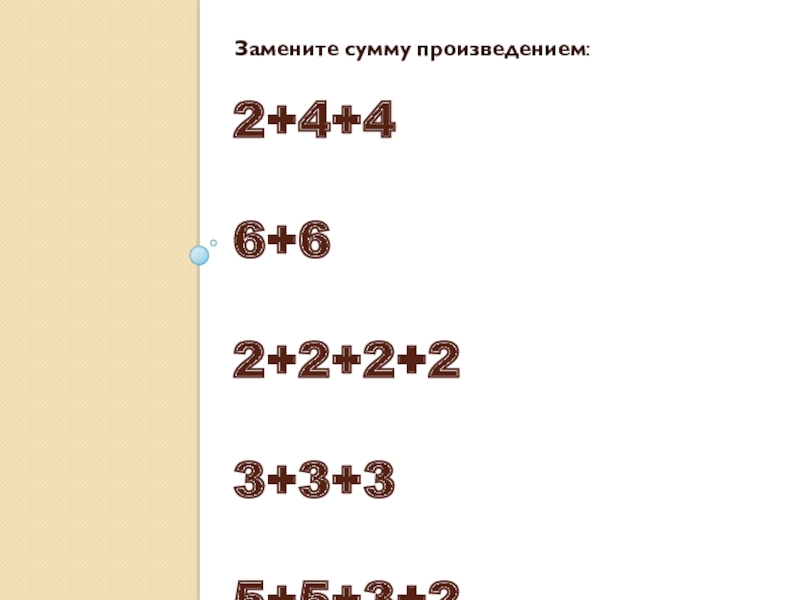 2+4+4 6+6 2+2+2+2 3+3+3 5+5+3+2Замените сумму произведением: