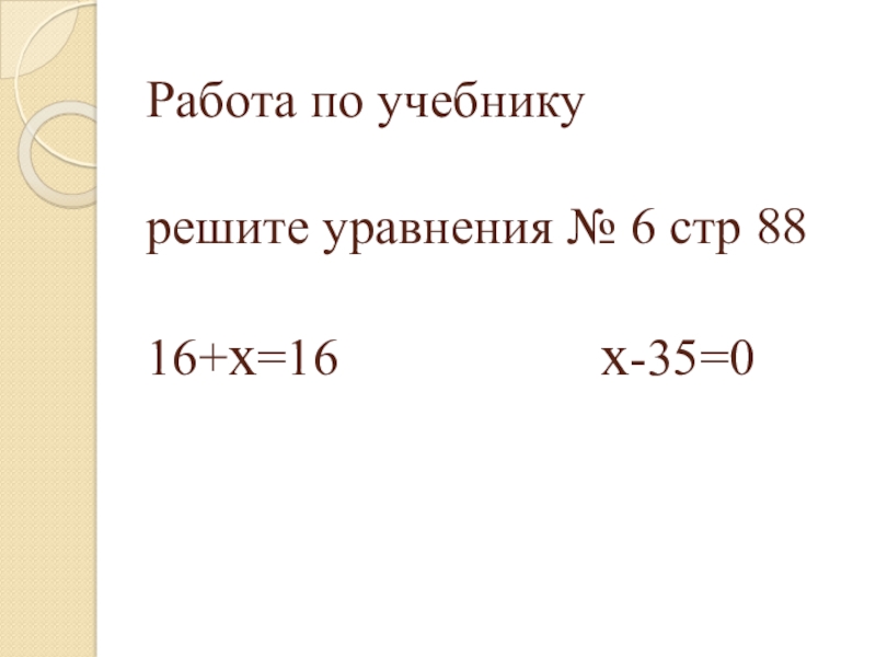 Слайд 18Работа по учебнику решите уравнения № 6 стр 88 16+х=16