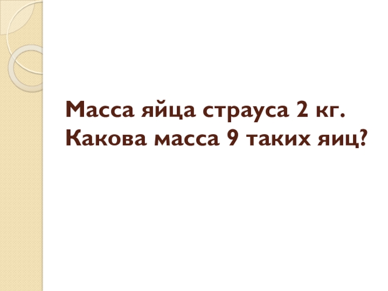 Слайд 5Масса яйца страуса 2 кг. Какова масса 9 таких яиц?