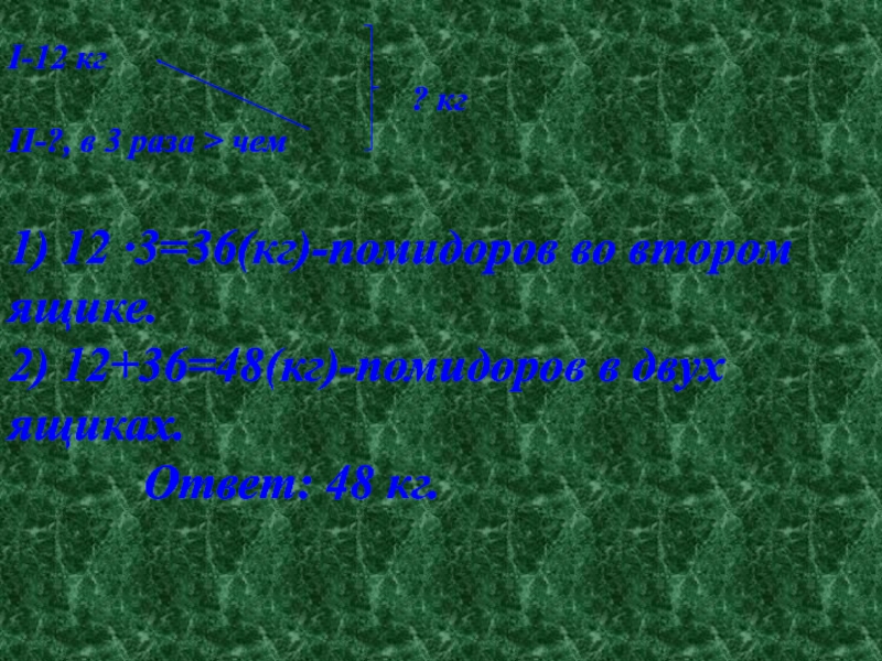 2) 12+36=48(кг)-помидоров в двух ящиках.
