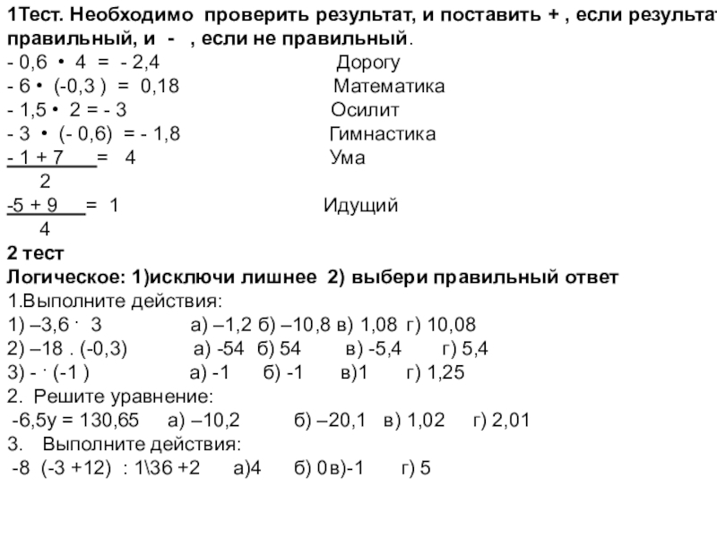 Слайд 391Тест. Необходимо проверить результат, и поставить + , если результат