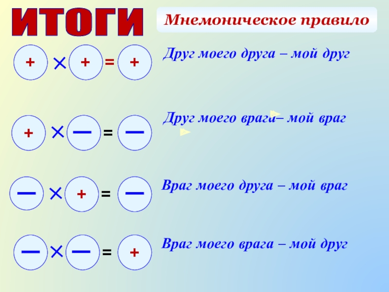 Умножение положительных и отрицательных чисел.