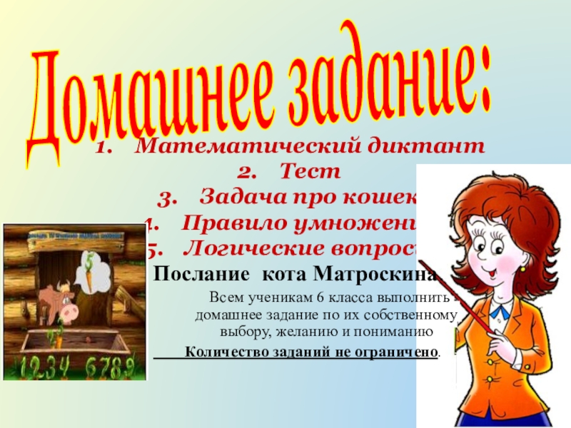 Всем ученикам 6 класса выполнить домашнее задание по их собственному выбору, желанию и пониманию