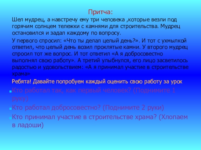 У первого спросил: «Что ты делал целый день?». И тот с ухмылкой ответил, что целый день возил проклятые камни. У второго мудрец спросил тот же вопрос. И тот ответил «А я добросовестно выполнял свою работу». А третий улыбнулся, его лицо засветилось радостью и удовольствием: «А я принимал участие в строительстве храма»