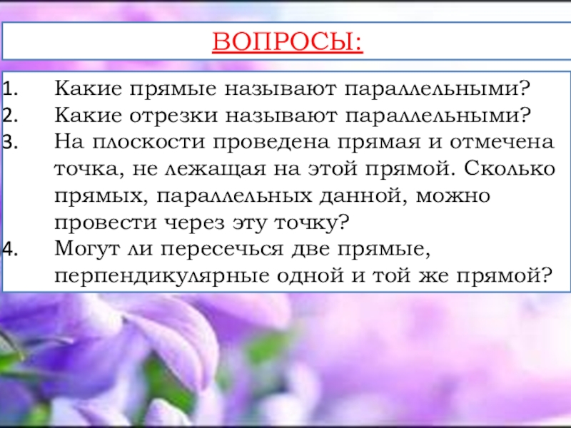 ВОПРОСЫ:Какие прямые называют параллельными?Какие отрезки называют параллельными?На плоскости проведена прямая и отмечена точка, не лежащая на этой