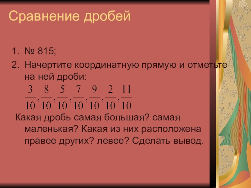 Сравнение дробей№ 815;Начертите координатную прямую и отметьте на ней дроби:Какая дробь самая большая? самая маленькая? Какая из