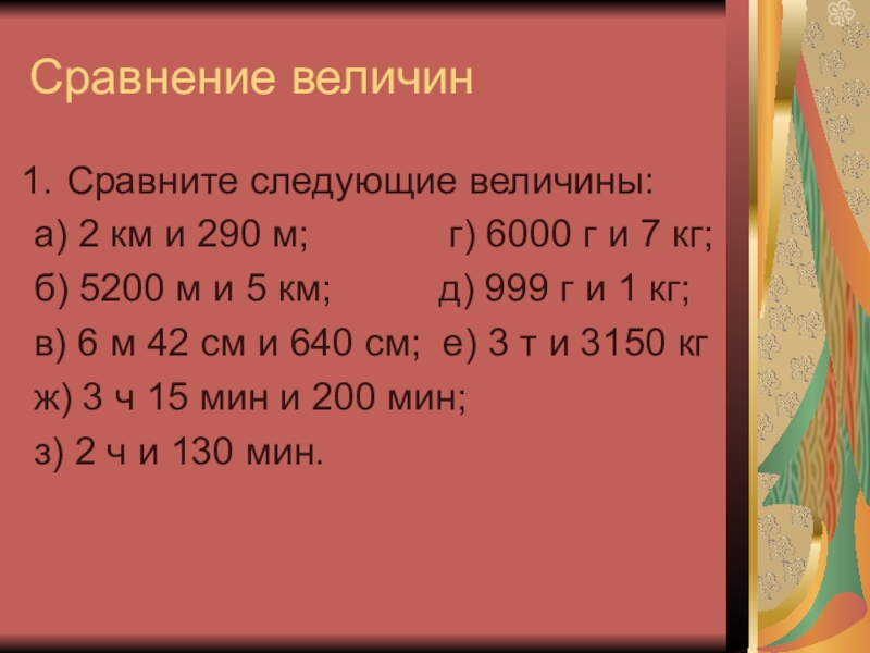 Сравнение величинСравните следующие величины:а) 2 км и 290 м;       г) 6000