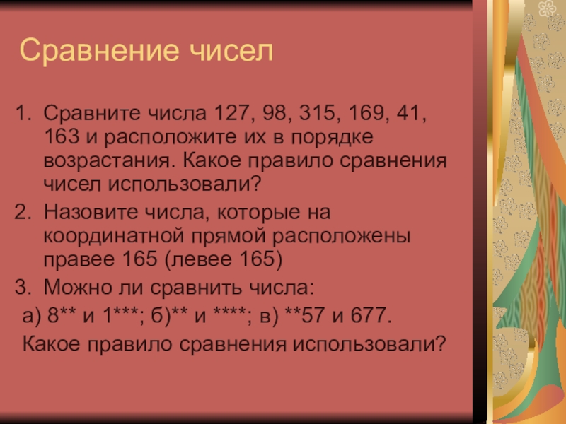 Сравнение чиселСравните числа 127, 98, 315, 169, 41, 163 и расположите их в порядке возрастания. Какое правило сравнения чисел использовали?Назовите числа, которые на координатной прямой расположены правее 165 (левее 165)Можно ли сравнить числа:а) 8** и 1***;