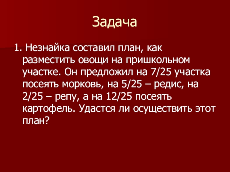 Задача1. Незнайка составил план, как разместить овощи на пришкольном участке. Он предложил на 7/25 участка посеять морковь,