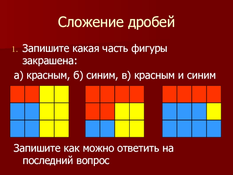Сложение дробейЗапишите какая часть фигуры закрашена:а) красным, б) синим, в) красным и синимЗапишите как можно ответить на