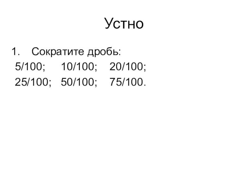 УстноСократите дробь:5/100; 10/100; 20/100;25/100; 50/100; 75/100.