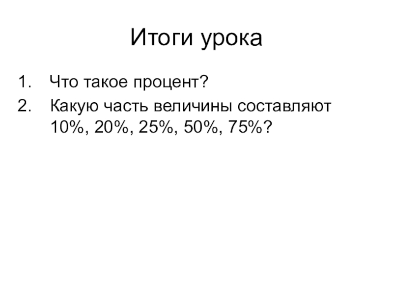 Итоги урокаЧто такое процент?Какую часть величины составляют 10%, 20%, 25%, 50%, 75%?