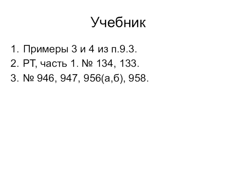 УчебникПримеры 3 и 4 из п.9.3.РТ, часть 1. № 134, 133.№ 946, 947, 956(а,б), 958.