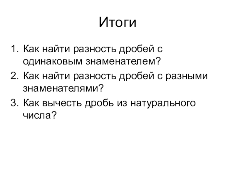 ИтогиКак найти разность дробей с одинаковым знаменателем?Как найти разность дробей с разными знаменателями?Как вычесть дробь из натурального
