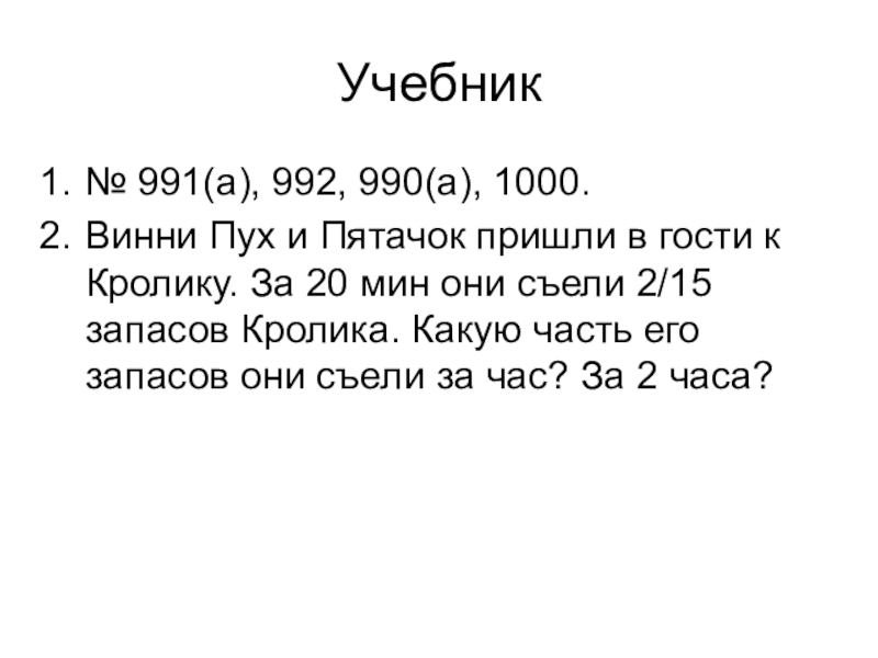 Учебник№ 991(а), 992, 990(а), 1000.Винни Пух и Пятачок пришли в гости к Кролику. За 20 мин они