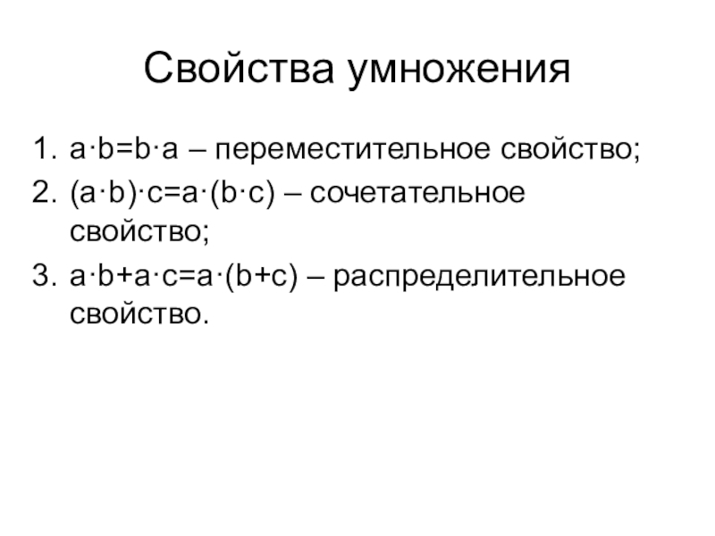Свойства умноженияa·b=b·a – переместительное свойство;(a·b)·c=a·(b·c) – сочетательное свойство;a·b+a·c=a·(b+c) – распределительное свойство.