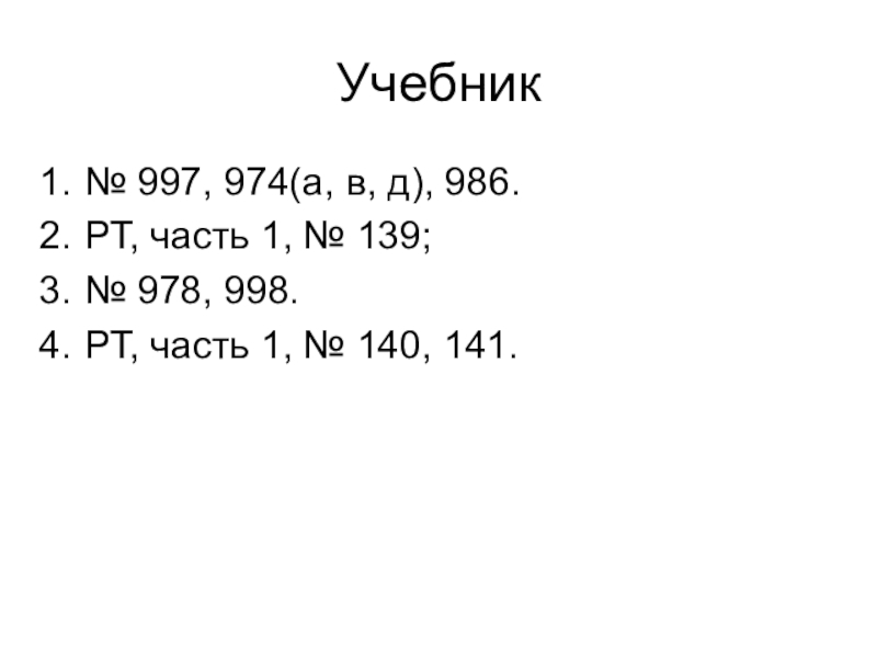 Учебник№ 997, 974(а, в, д), 986.РТ, часть 1, № 139;№ 978, 998.РТ, часть 1, № 140, 141.