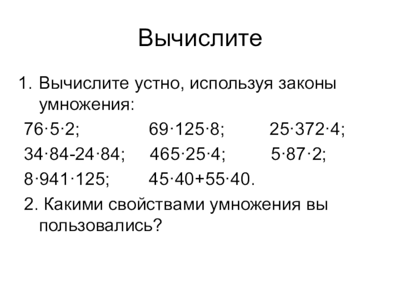 ВычислитеВычислите устно, используя законы умножения:76·5·2;       69·125·8;     25·372·4;34·84-24·84;