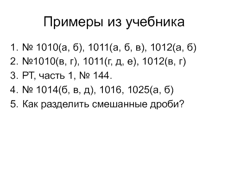 Примеры из учебника№ 1010(а, б), 1011(а, б, в), 1012(а, б)№1010(в, г), 1011(г, д, е), 1012(в, г)РТ, часть