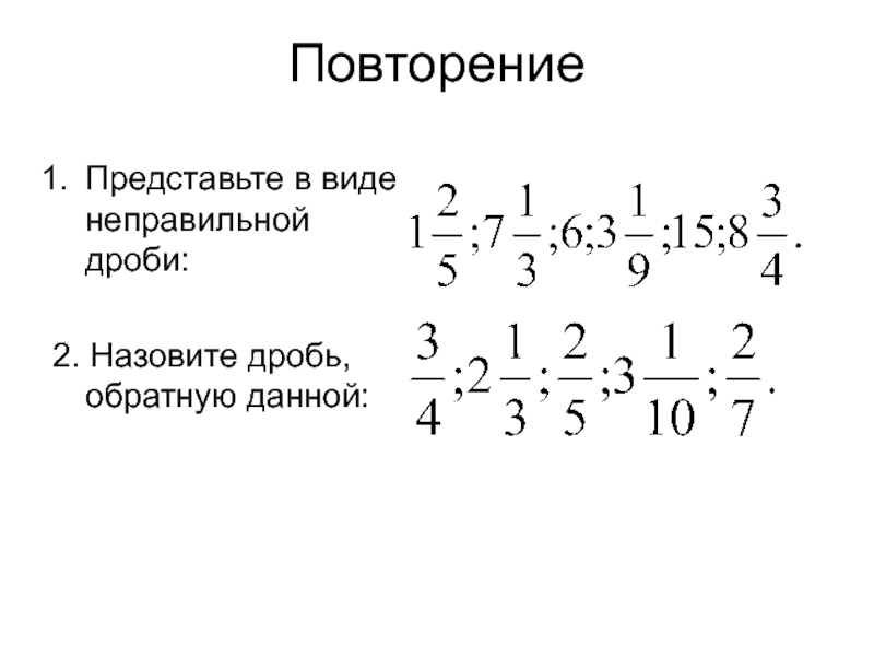 ПовторениеПредставьте в виде неправильной дроби:2. Назовите дробь, обратную данной: