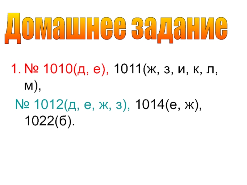 № 1010(д, е), 1011(ж, з, и, к, л, м),№ 1012(д, е, ж, з), 1014(е, ж), 1022(б).Домашнее задание
