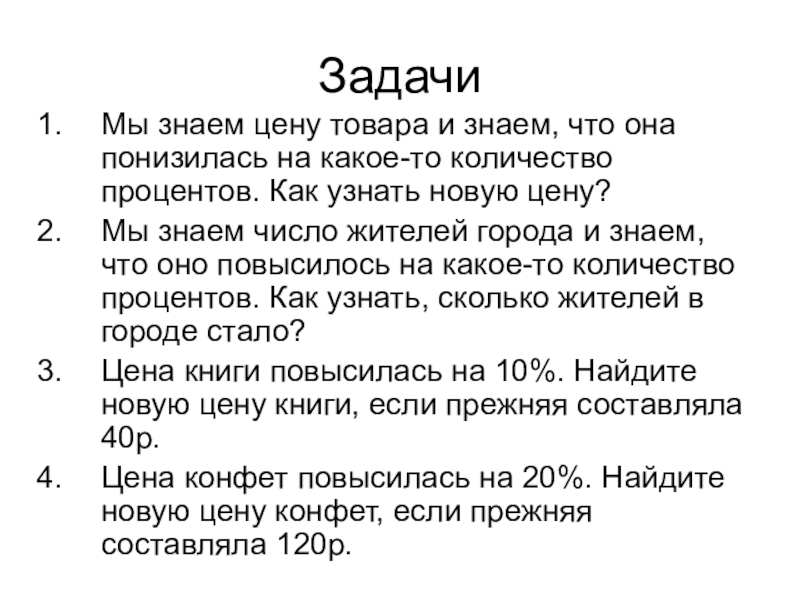ЗадачиМы знаем цену товара и знаем, что она понизилась на какое-то количество процентов. Как узнать новую цену?Мы