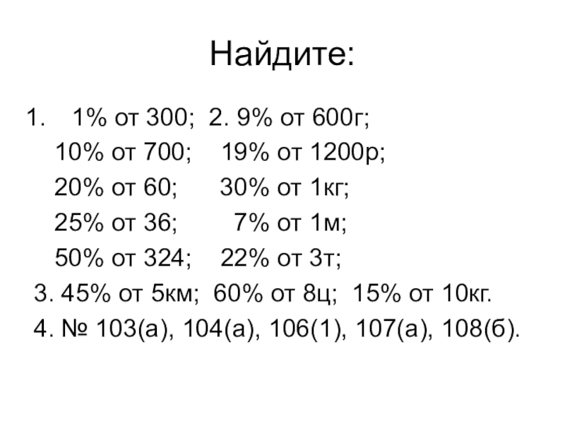 Найдите:1% от 300; 2. 9% от 600г; 10% от 700; 19% от 1200р; 20% от 60; 30% от 1кг; 25% от 36; 7% от 1м; 50%