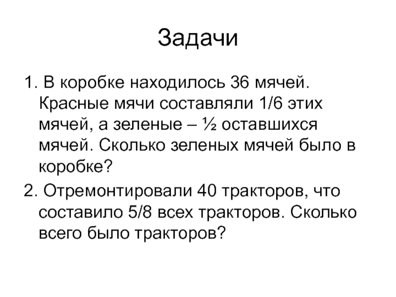 Задачи1. В коробке находилось 36 мячей. Красные мячи составляли 1/6 этих мячей, а зеленые – ½ оставшихся