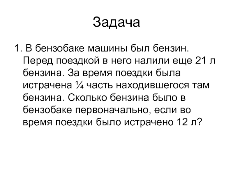 Задача1. В бензобаке машины был бензин. Перед поездкой в него налили еще 21 л бензина. За время